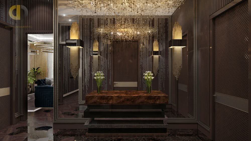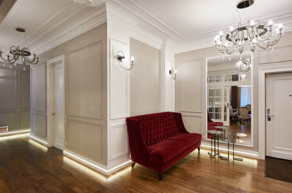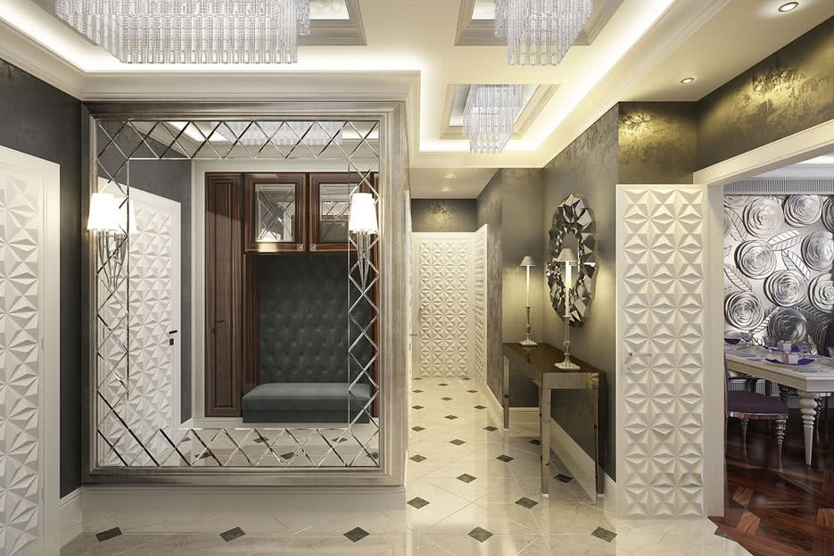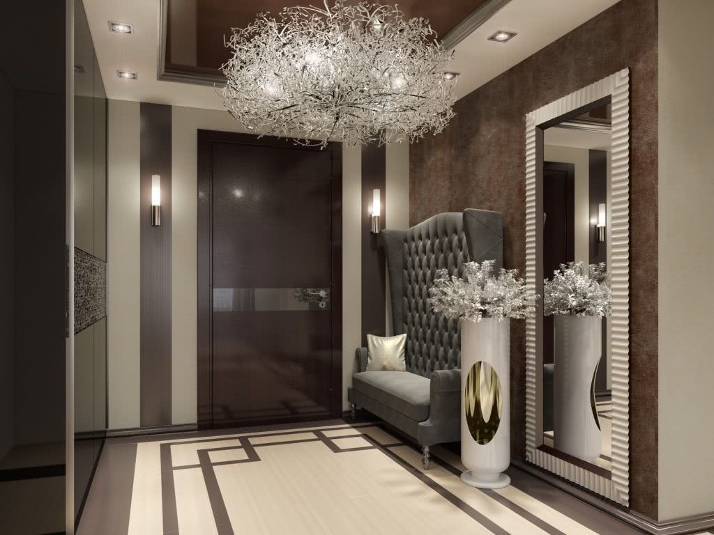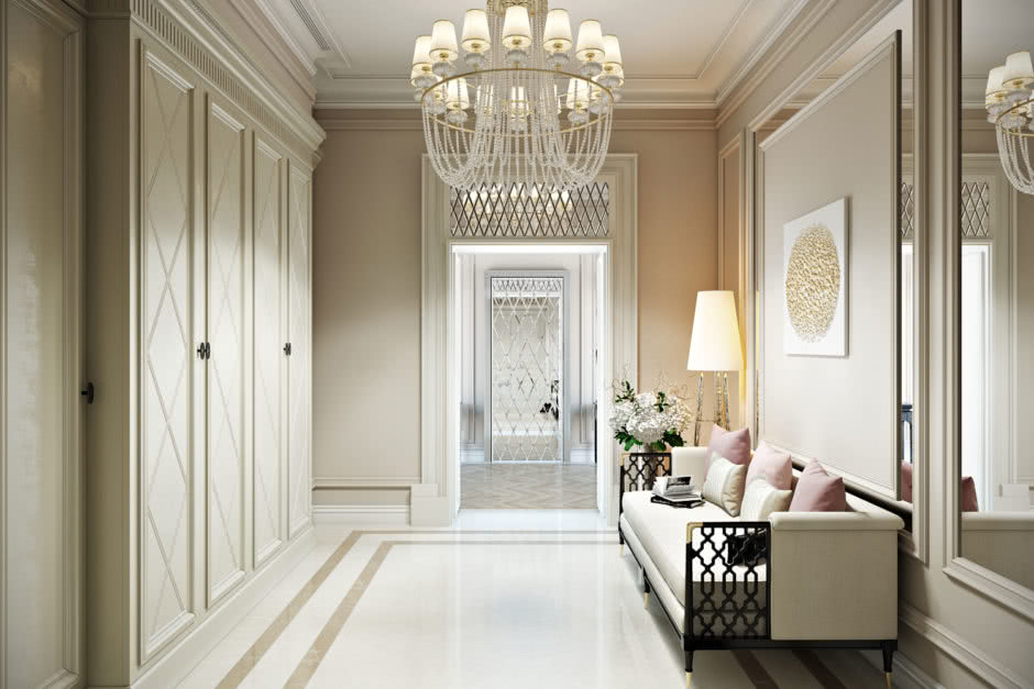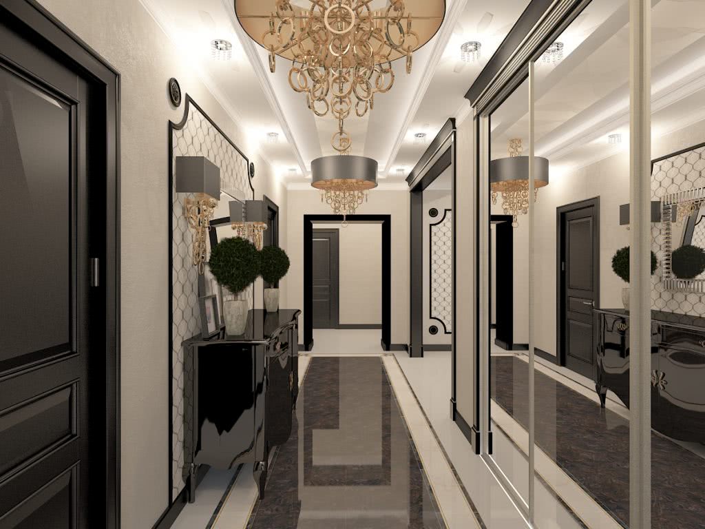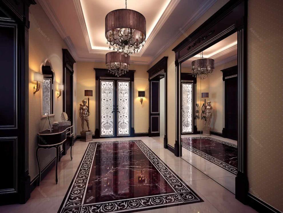 Стиль считается роскошным и слегка вычурным, поскольку предусматривает внедрение смелых идей и нестандартных деталей. В коридоре допустимы многоуровневые потолки, элементы лепнины, фактурная облицовка стен и т.д.