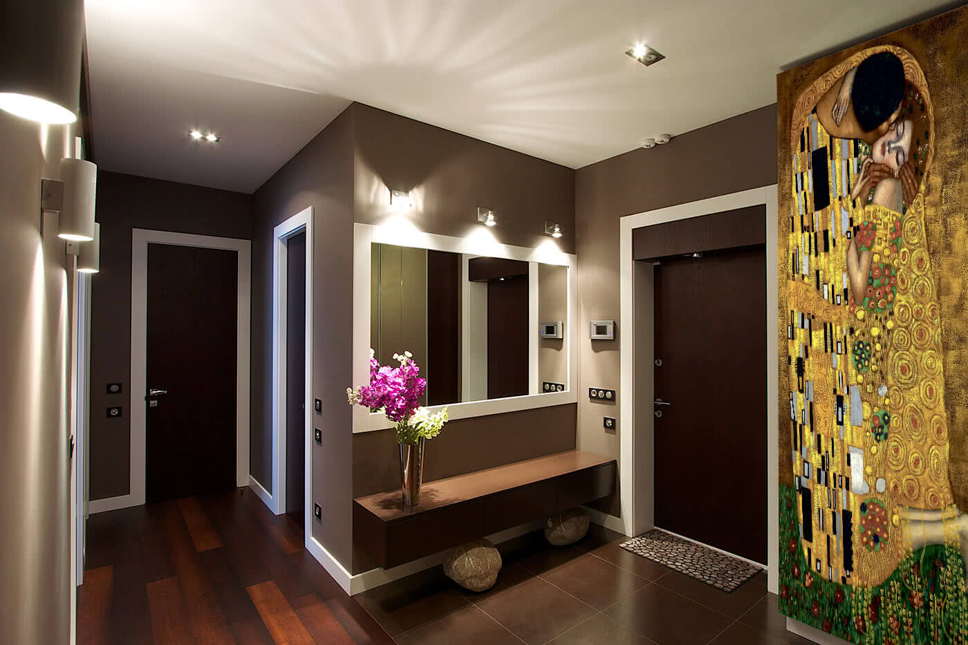 Еще одно важное дело — окраска и узоры обоев для прихожей. Если выбираете темные цвета, то декор должен быть тонким, гармоничным, без динамических композиций