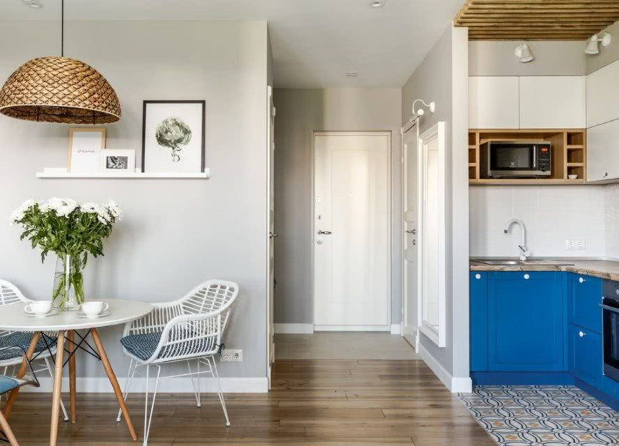В условиях помещения ограниченной площади особенно востребован белый цвет. Чтобы избежать эффекта стерильного помещения, белизну несложно разбавить яркими акцентами в виде входной двери или предметов меблировки. Отлично разбавят белый цвет фасады венге или орех.
