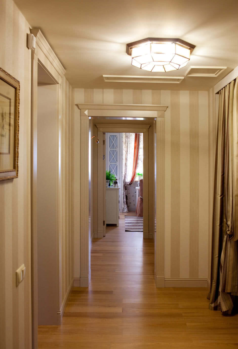 Интересным решением станет обустройство фальш-окна в нише коридора, драпированного нежно-розовыми, пшеничными, лавандовыми занавесками. Рядом с имитацией окна уместно разместить банкетку, обтянутую однотонной со шторами тканью. На ней можно с удобством переобуться и предложить присесть случайным посетителям дома. Оригинальные арт-объекты в прихожей разбавят монотонность отделки со сдержанной колористической гаммой.