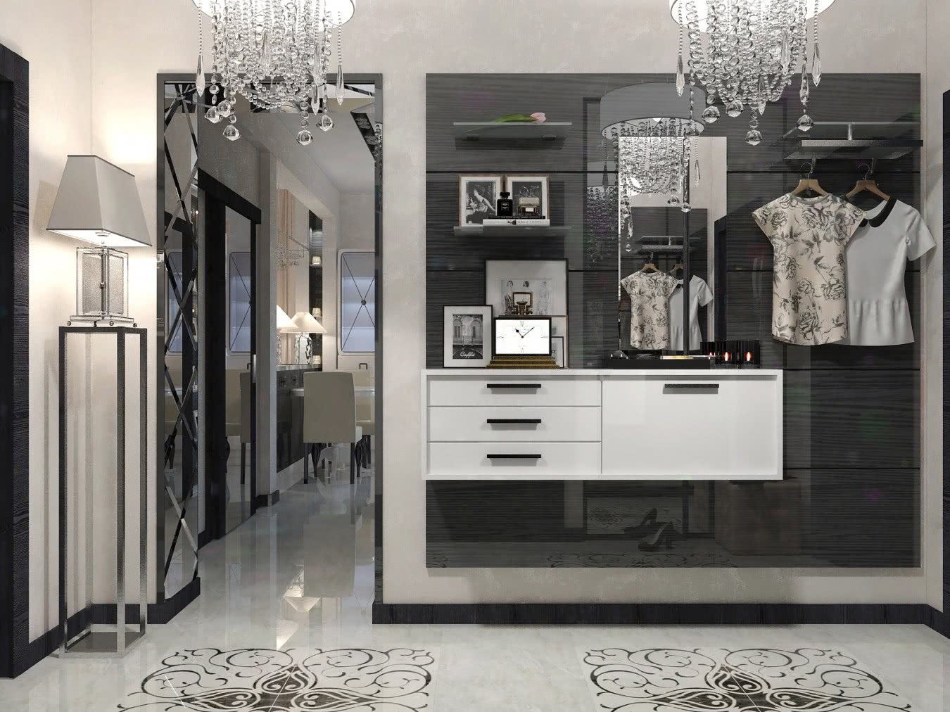 Классика. Символ сдержанности и элегантности, гармонично смотрится в белых и сероватых оттенках, предполагает наличие большого количества зеркальных поверхностей.