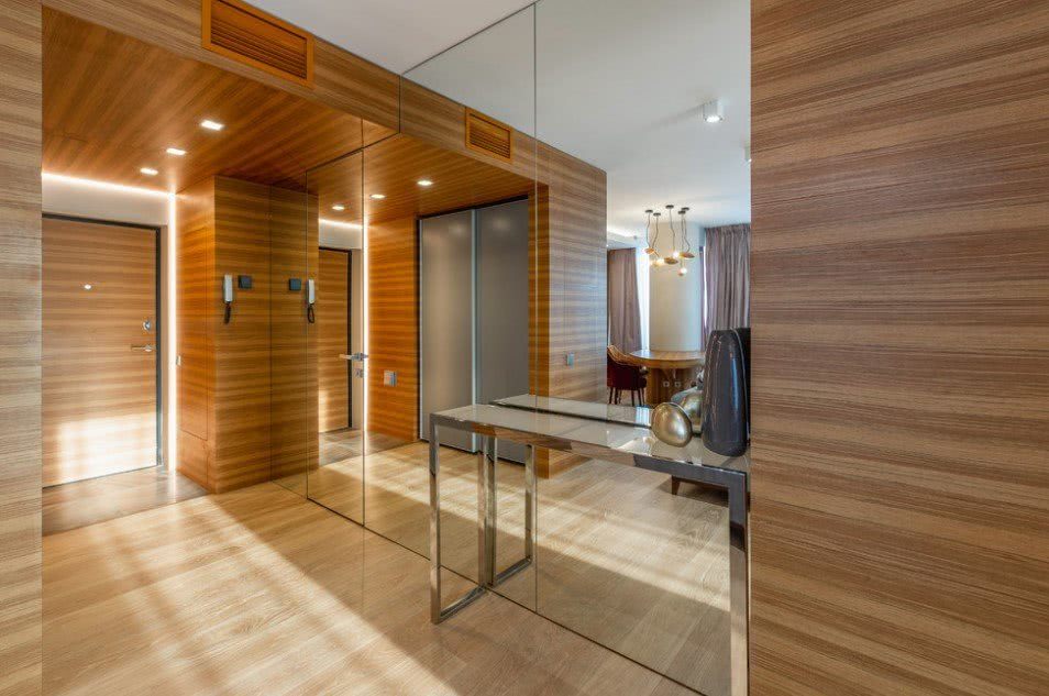 На фото прихожей в квартире редко можно заметить местное освещение. Дело в том, что оно скрывается под козырьком встраиваемой мебели, внутри ниш или гардеробной зоны. Также за местное освещение может отвечать настольная лампа. Но этот прием больше присущ классическому дизайну.