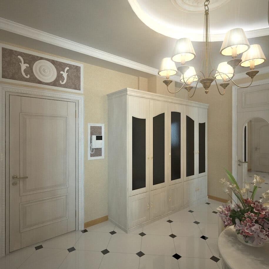 Современный, в холодных тонах. В качестве основы можно использовать бледно-голубой или нюдовый розовый. Яркие элементы рекомендуют подобрать синего, изумрудного и фиолетового цветов. Можно расставить акценты с помощью серебряного и черного. Массивную мебель лучше заменить небольшим комодом и несколькими крючками для верхней одежды. Выполненные в темных оттенках, они впишутся в холодную цветовую гамму.
