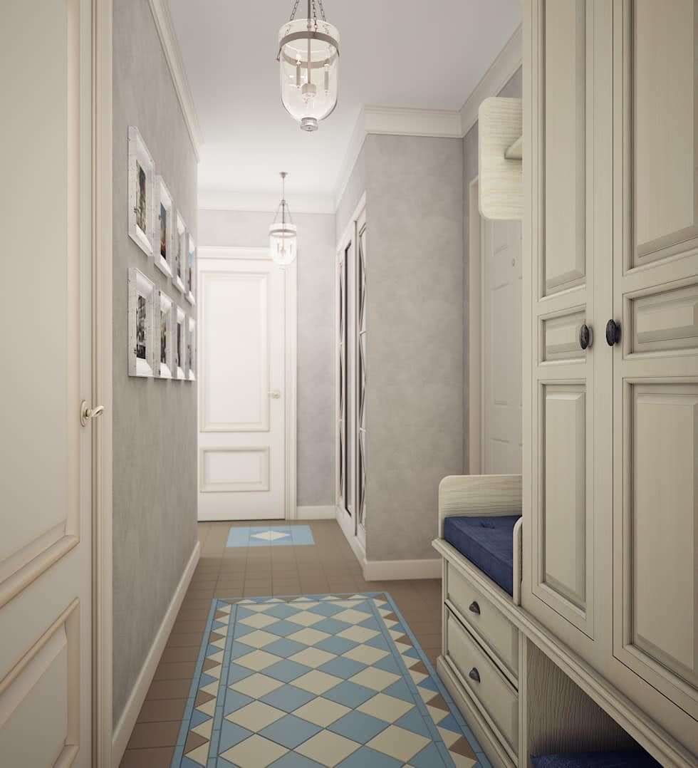 Узкое длинное пространство удобно разделить на функциональные зоны: у входа в квартиру и вестибюль. Использование разноуровневых потолков со встроенной подсветкой, цветовое решение зон, отделка позволят создать уютный интерьер в любом стиле.