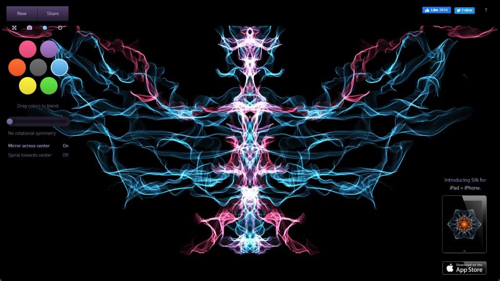 Тут можно создавать как завораживающие симметричные узоры, так и сложные рисунки, напоминающие танец светлячков или роспись на ткани. Получается всегда круто, даже если совсем не умеешь рисовать. Можно сохранить изображение себе на заставку.