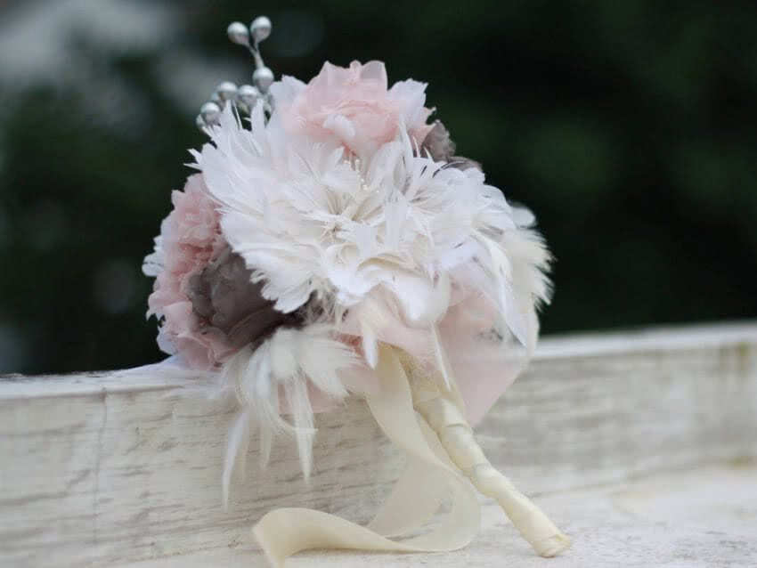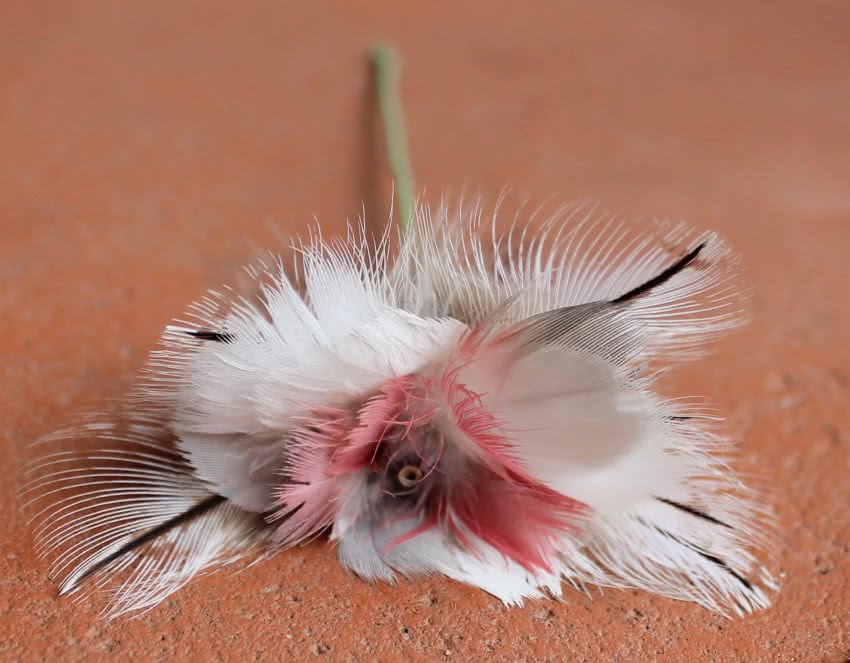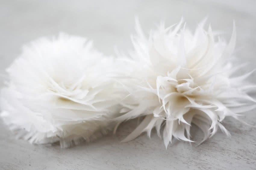 От пыли их очищают при помощи специальной метелки на перьевой основе, сдувать ее можно и направленным потоком холодного воздуха из фена. Гладкие материалы, например, полимерную глину, протирают влажной салфеткой. Периодически производится опрыскивание с использованием смеси воды и яблочного уксуса – такой подход возможен для тканевых композиций. Цветы из фетра и атласа можно стирать.