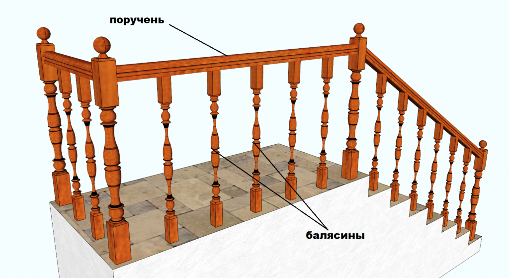 Балясины. Представляют собой вертикально установленные опоры для перил, как правило, несут не только функциональный, но и декоративный характер. Могут быть разных форм и конфигураций, выполняются из различных материалов.