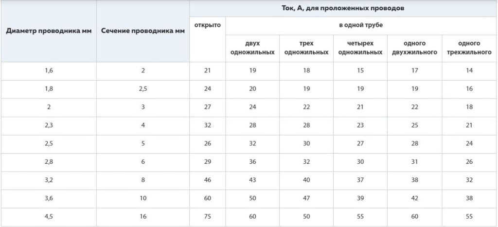 Таблица мощности по диаметру провода