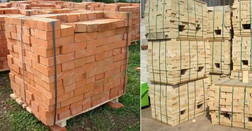 - Строительные кирпичи. Они нужны в двух разновидностях – обожженные полнотелые и шамотные огнеупорные. Сырьем для первой разновидности, предназначенной для сооружения наружной части корпуса и дымохода, служит красная глина. Внутри топка и дымоходный канал футеруется шамотным кирпичом: он имеет более светлый оттенок и выдерживает нагревание до +1200 градусов.
