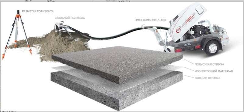 Прочность основной строительной смеси здесь обеспечивается за счет применения качественных материалов в виде мытого крупнозернистого песка и цемента М500, а также полипропиленовой фибры и металлической сетки. Для заливки полусухой стяжки применяют специальное оборудование-пневмонагнетатель (растворонасос).