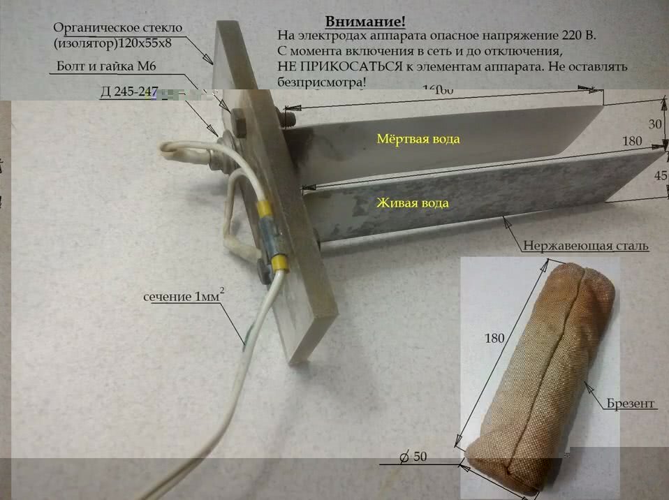 - Анод-пластина помещается в мешок, там будет образовываться мёртвая вода, а катод-пластина помещается в основную ёмкость, там будет живая вода.