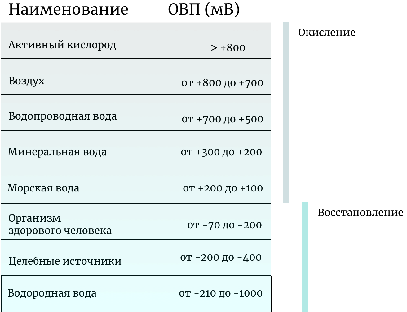 Не менее важным является показатель окислительно-восстановительного потенциала (ОВП). Он указывает на умение вещества восстанавливать или окислять другие вещества. Положительный показатель ОВП говорит, что напиток является окислителем и забирает электроны у клеток, провоцируя появление свободных радикалов. Из-за них появляются неполадки со здоровьем. Питье с отрицательным значением ОВП, напротив, содержит антиоксиданты, помогающие восстановлению организма.