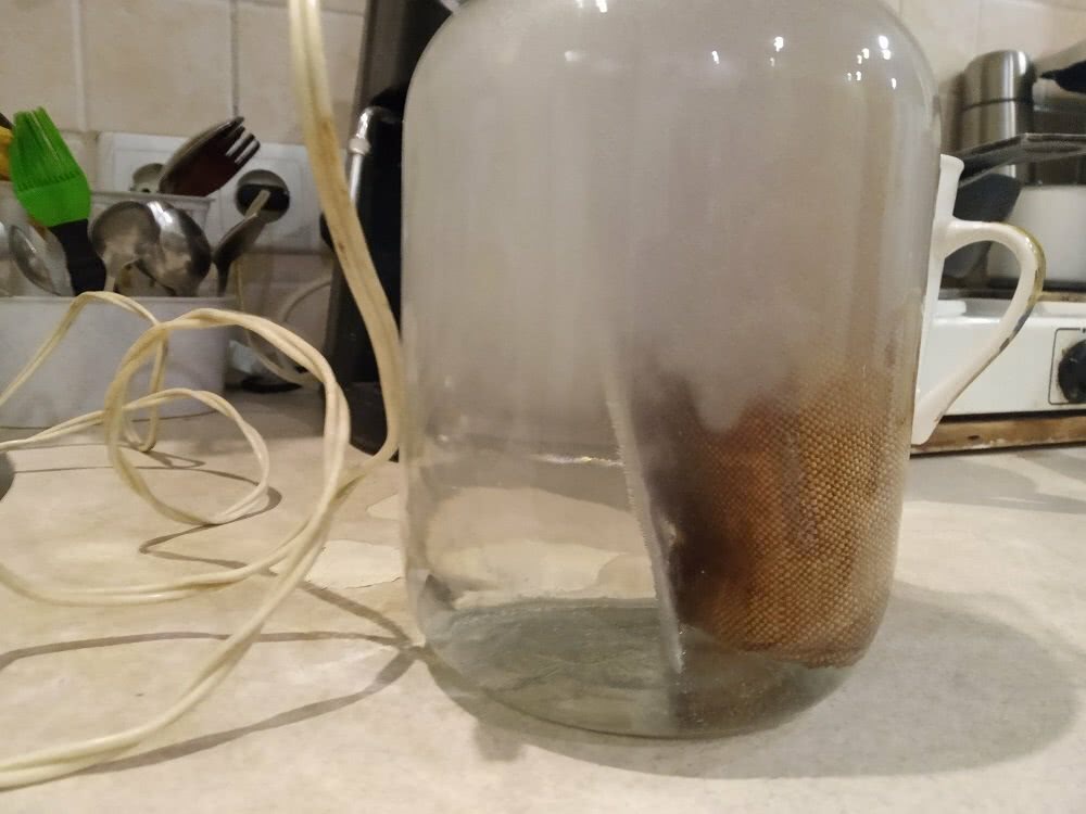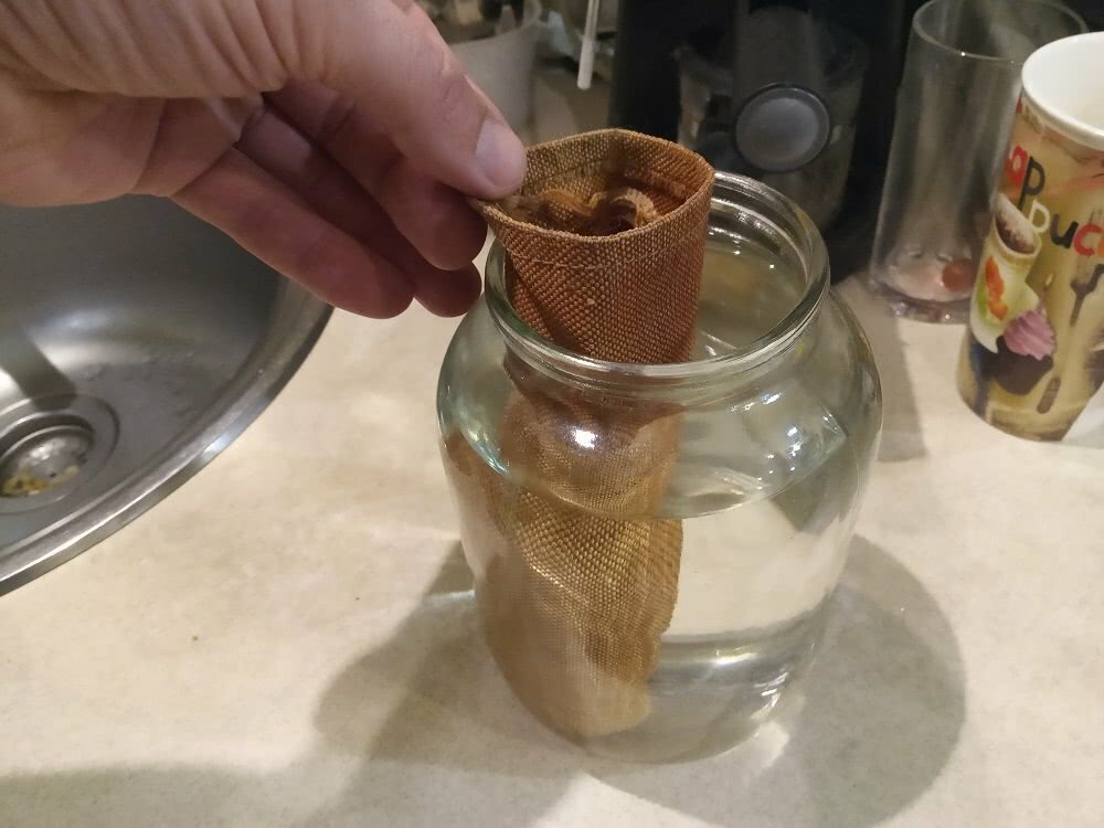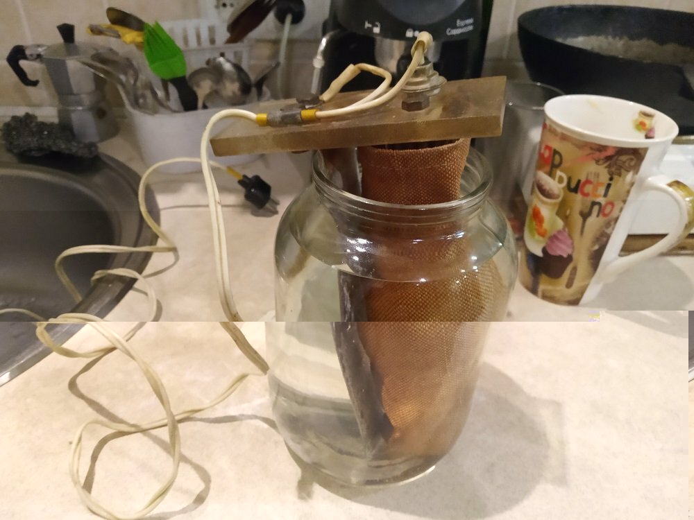 - Мешочек из плотной ткани (джинсовая, брезентовая или любая подходящая), воздух через такую ткань должен плохо проходить и она должна быть водонепроницаемая. Мешочек нужен для того, чтобы собрать анолит на аноде. Можно сделать проще и взять не мешочек, а любую ёмкость которая поместится в банку, главное, чтобы вода не выходила за края и не было смешивания.