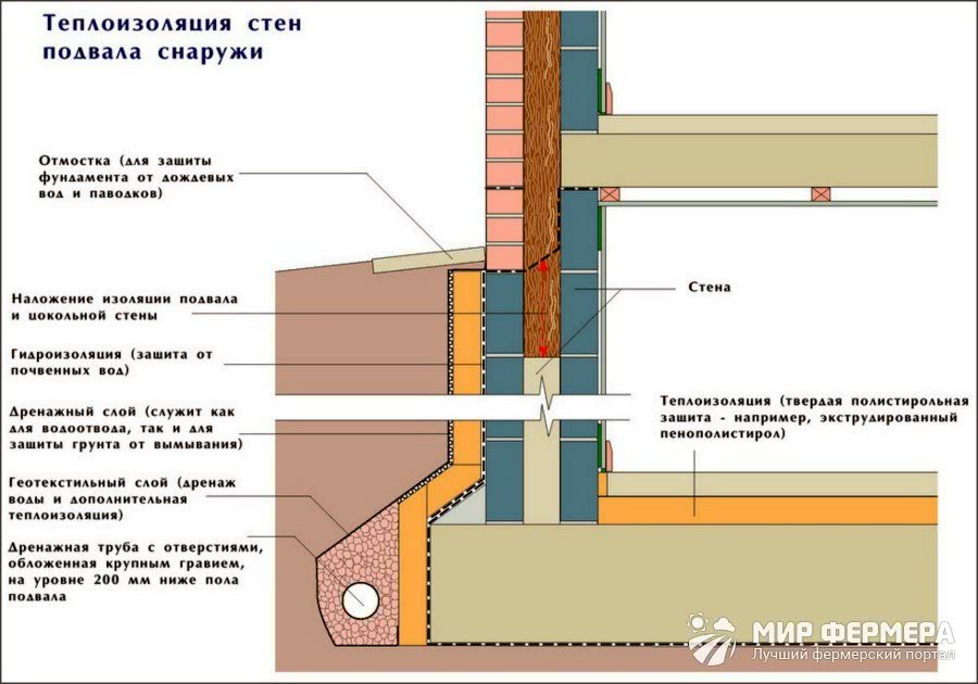 При этом используются готовые обмазочные смеси для гидроизоляции, грунтовка, армирование, рубероид, полимерные мембраны, мастики и другие материалы. После выполнения работ производят обратную засыпку песком, гравием и грунтом, проложив геотекстиль и дренажные трубы. Конечным этапом становится армирование и заливка отмостки.