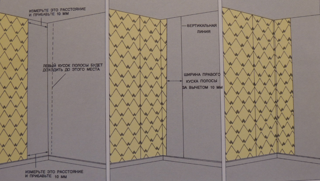 Согласно данному способу, материал пропускается на 50 мм на смежную стенку за угол, а следующий лист приклеивают внахлест.