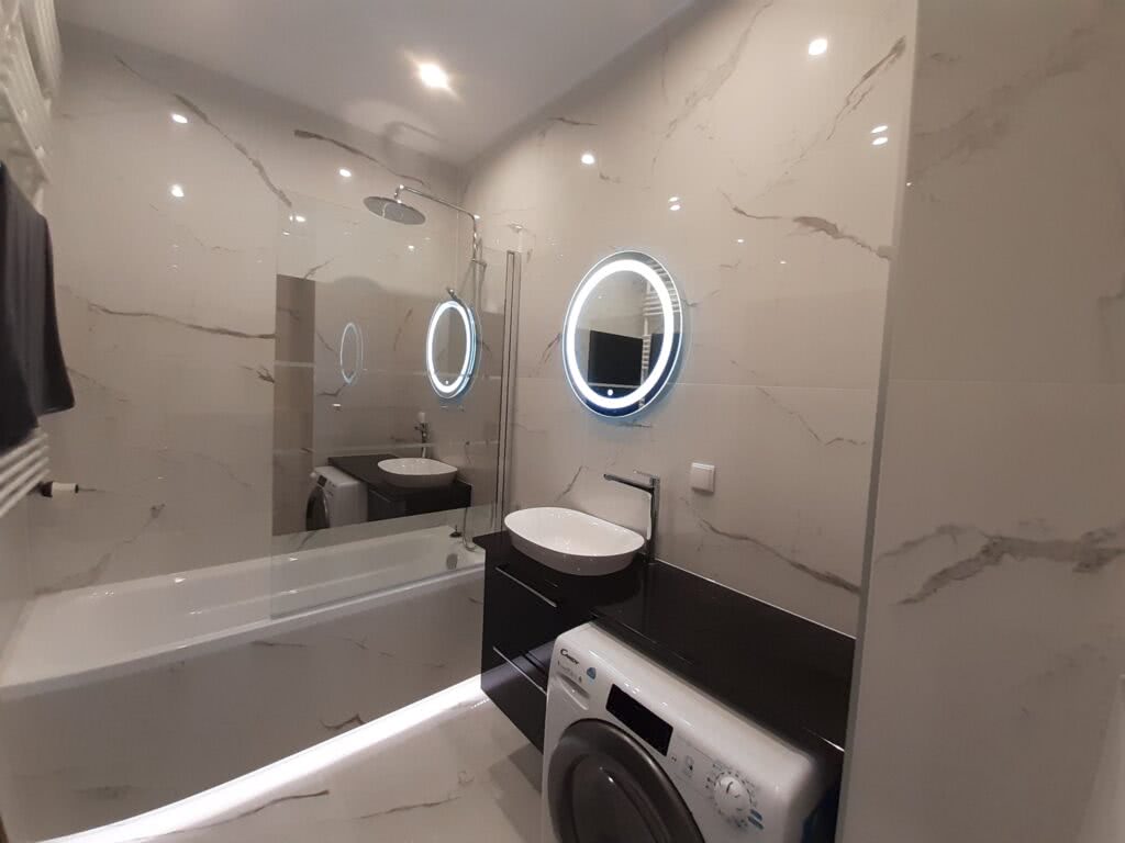 Но обратите внимание, что такая раскладка не подойдет для ванных комнат с низкими потолками.
