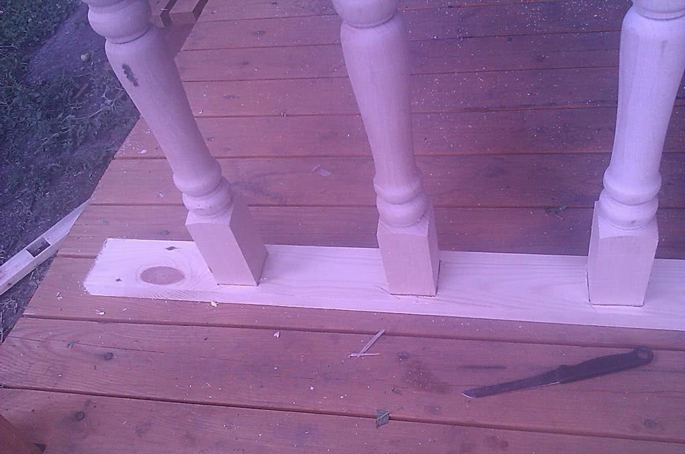 - Саморезы необходимо вкрутить как в верхнюю, так и в нижнюю часть каждой балясины. Делается это под углом, чтобы кончики располагались вертикально и слегка выступали.