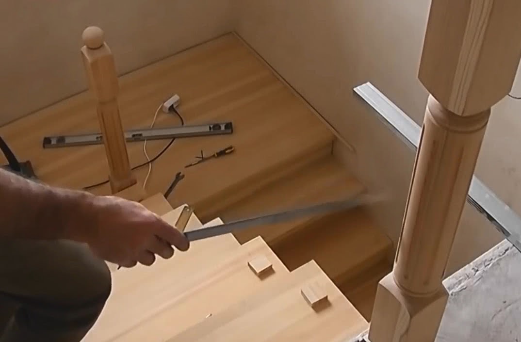 - Все стойки устанавливаются строго на свои места. Далее их прикручивают саморезами к поверхности ступени или тетиве. Чтобы получившаяся конструкция была более устойчивой, каждую опору следует закрепить парой саморезов сверху и снизу, а шляпки утопить вглубь дерева.