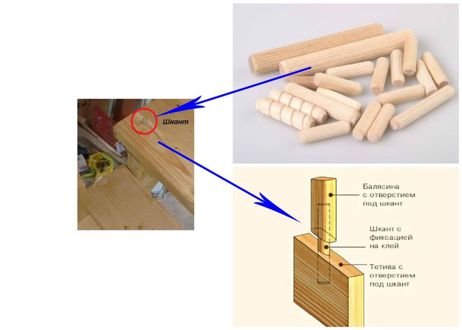 Шкант представляет собой деревянный двухсторонний дюбель. Для крепления балясин выполняют следующие действия: