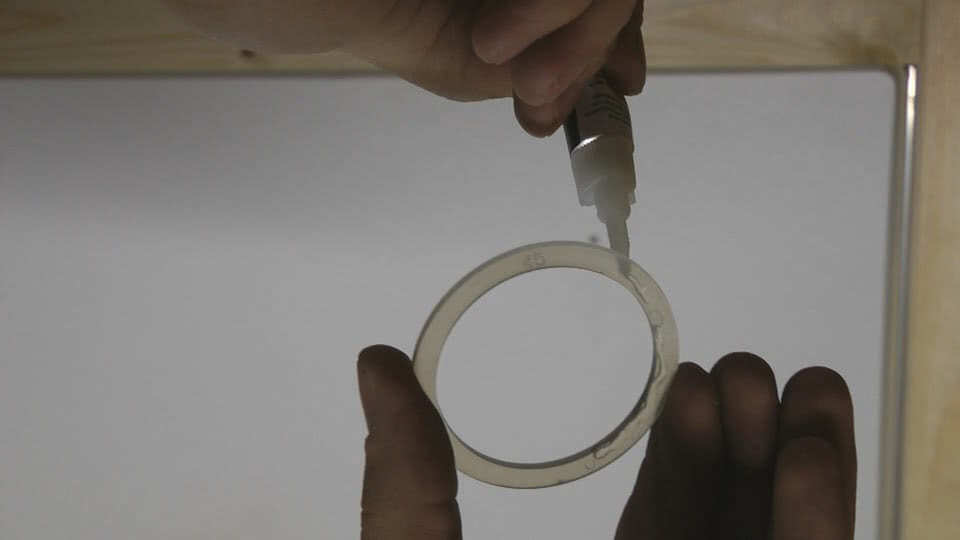 Фото:Для начала отметим места крепления на потолке. Затем нужно эти места “усилить”.Для этого используем:1) Кольцо (надо просить у потолочников), которое приклеиваем на место крепления суперклеем.