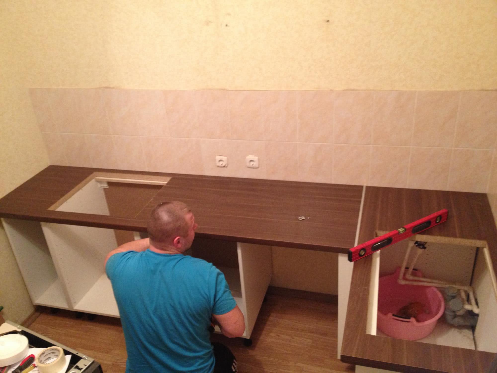 - На шкафы укладываем столешницу, следя за тем, чтобы между нею и задней стенкой кухни оставался зазор около 5 мм.