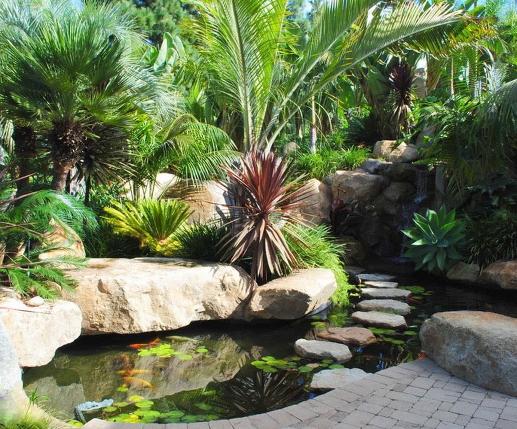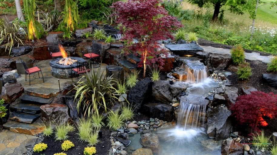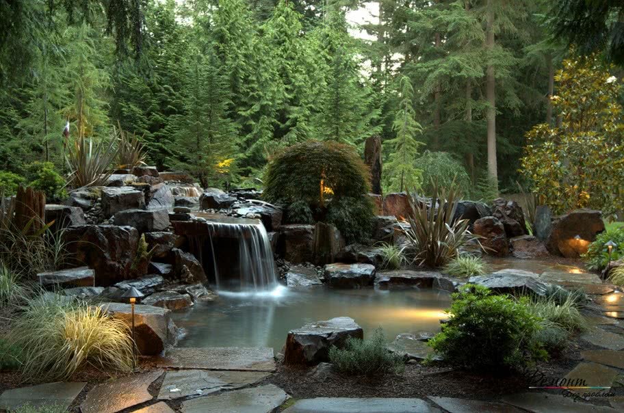 Японский – максимум естественности и мягких линий, каскадов, но без фонтанов. В дополнение статуи Будды, драконов, много камня и зелени.