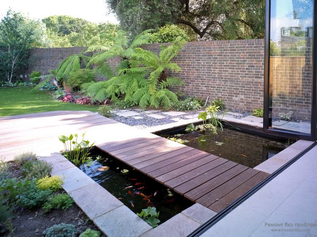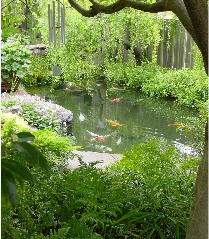 Китайский – уместен с китайским садом. Через водоем перекидывают мостик, рядом желательна беседка для чаепития. Обязательное изобилие рыбы, лотосы, пышная растительность и много валунов и камней.