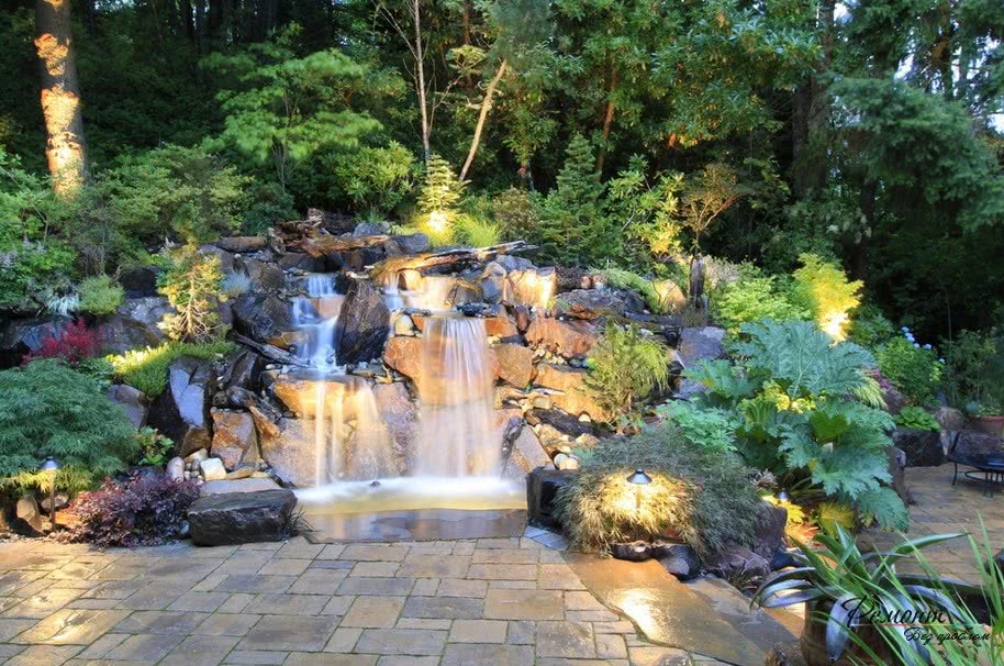 Водный каскад с водоемом и стилизованной площадкой для отдыха
