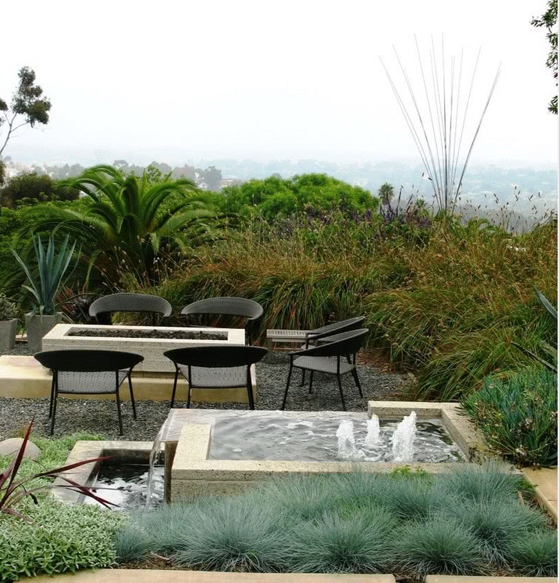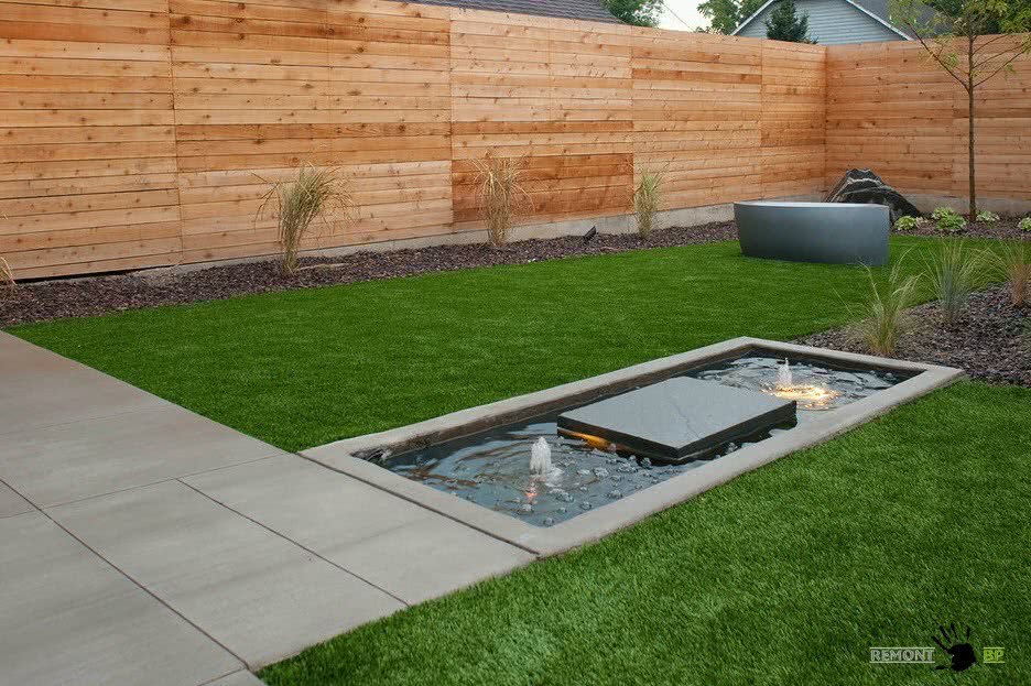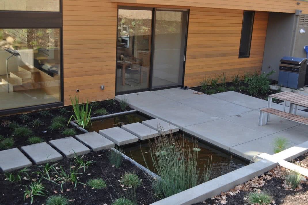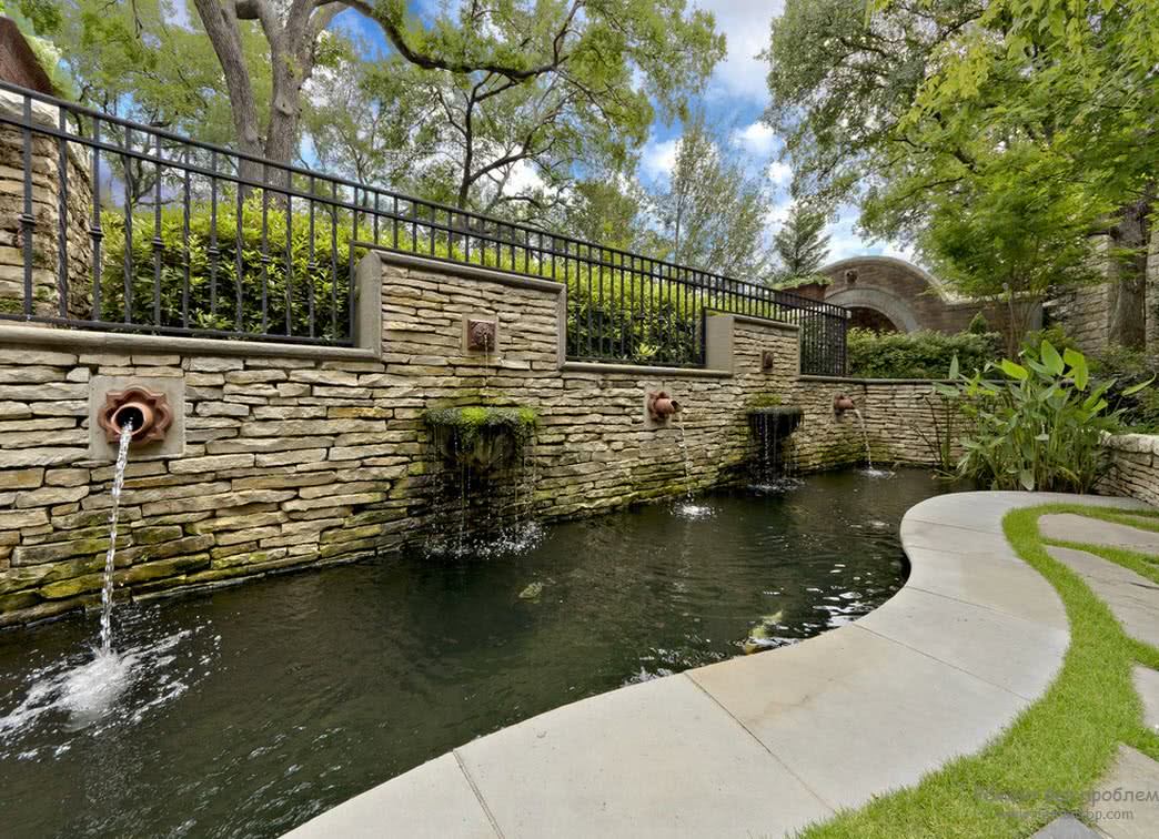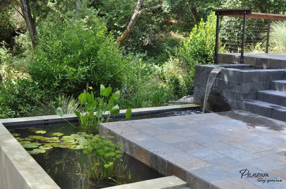Одна сторона площадки должна обрамляться высокой стеной из камня в форме полуовала с нисходящими ступенями, расположенной ближе к середине площадки, где она окончательно сравняется с уровнем земли. В центральной части этой стенки должен устраиваться каскадный водопад: вода внизу будет падать в небольшую чашу, а далее ручьем поступать в водоем. Это центральная часть ансамбля. По обе стороны от ручья и водоема на площадке, вымощеной плиткой, можно обустроить зону отдыха с лежаками для принятия солнечных ванн или столиком и скамейками для отдыха, детскую площадку или сад с экзотическими растениями в кадках.