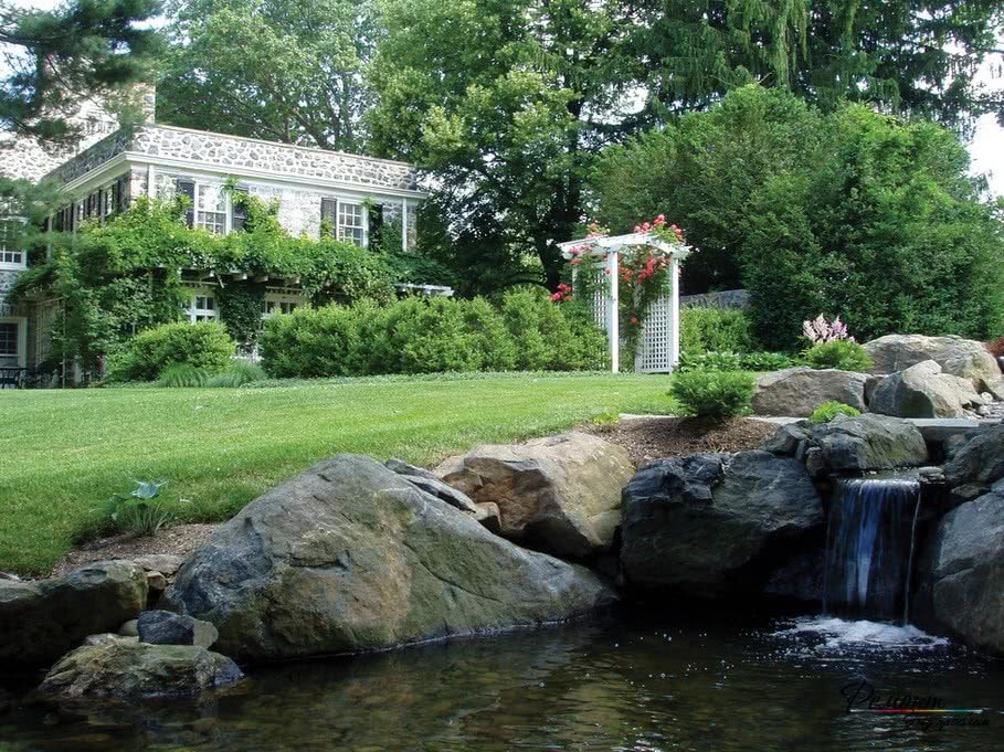 Все трубы водопровода на данном этапе нужно установить и скрыть под землей. Насосная система будет забирать воду из последнего водоема и передавать в верхнюю часть водопада. По пути вода очистится системой фильтрации, будет ниспадать в горки по ступеням в малый водоем, оттуда — переливаться ручьем в большой, собираться в слив к насосу и снова поступать к водопаду.