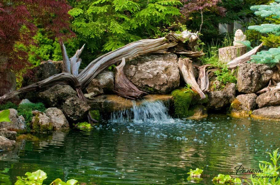 В качестве декора такого пруда очень часто используют фонтаны. Установить их не сложно даже без посторонней помощи. Также стоит отметить небольшие водопады, которые делают пейзаж более оживленным. Но все же для того, чтобы это имело действительно красивый вид, нужно довольно большая территория.