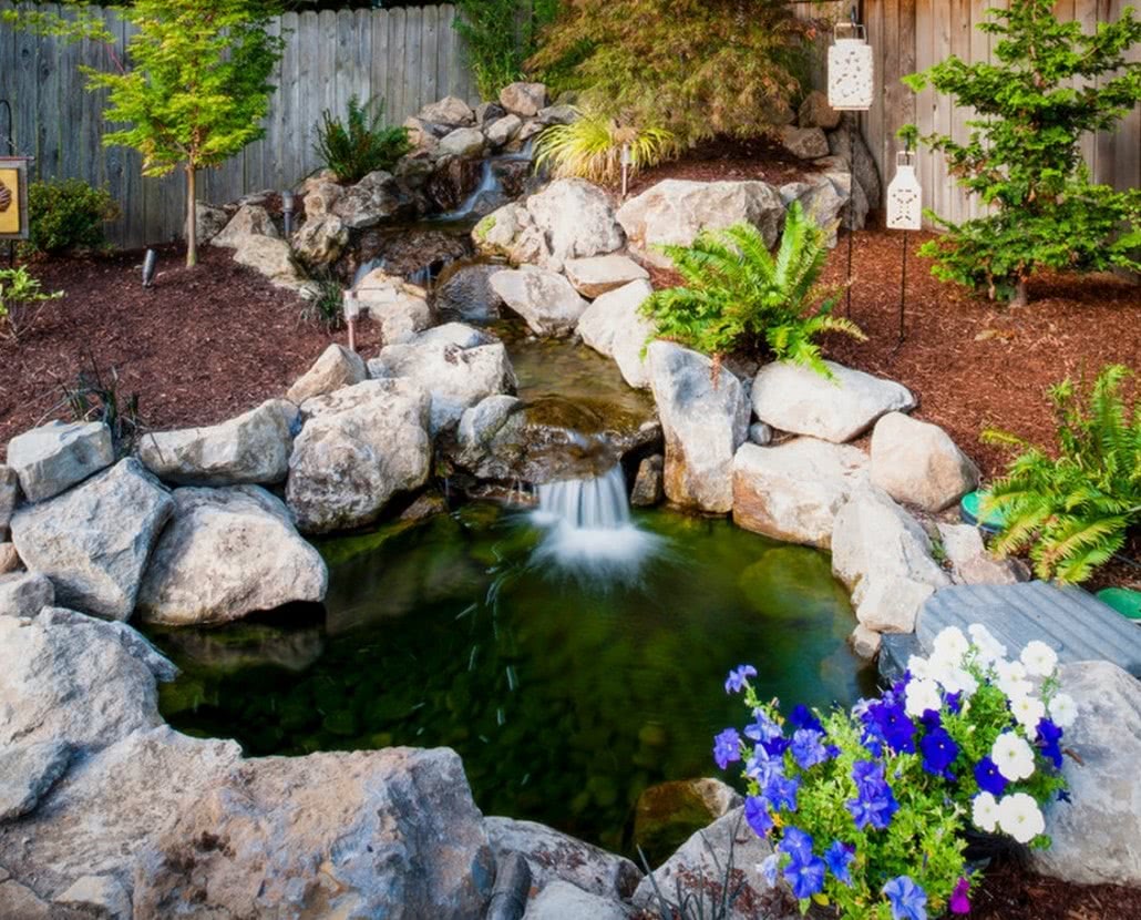 Но в данном случае небольшой пруд может просто потеряться на фоне камня. Чтобы очертить края, используйте гравийную отсыпку по всему периметру. Она не только подчеркнёт форму пруда, но и обратит внимание на цветовую гамму и фактуру рядом растущих цветов и кустарников.