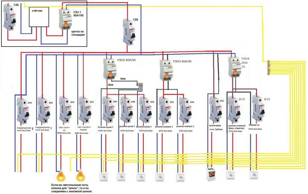 Чаще всего, в электрическую схему помимо автоматов на каждую групповую линию, входят еще вводной автомат, УЗО или дифференциальный автомат.
