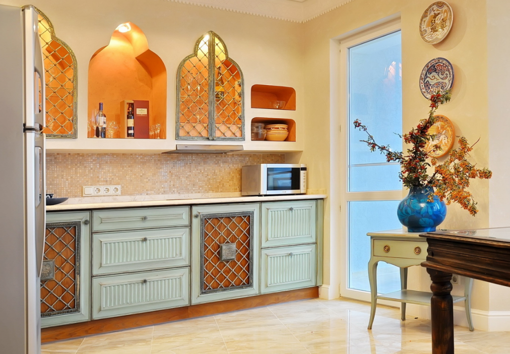 - на кухне могут быть кремовые ротанговые кресла, квадратный светлый стол с яркой скатертью. Шкафы для посуды светло-голубого цвета;