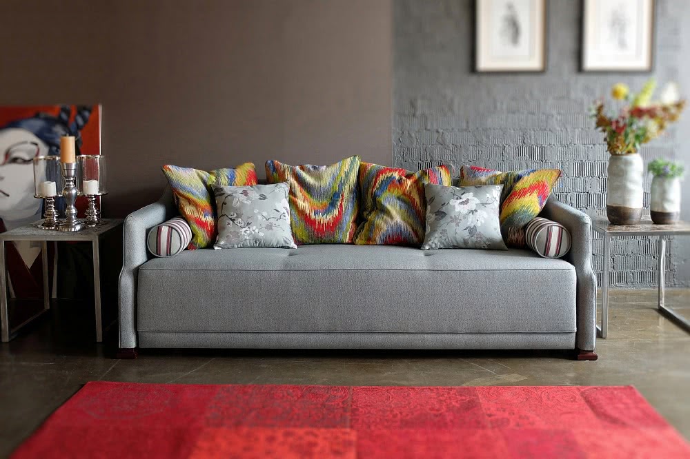 - Нейтральный диван и яркое окружение. Мебель спокойного оттенка комбинируют с яркой отделкой стен или текстилем.