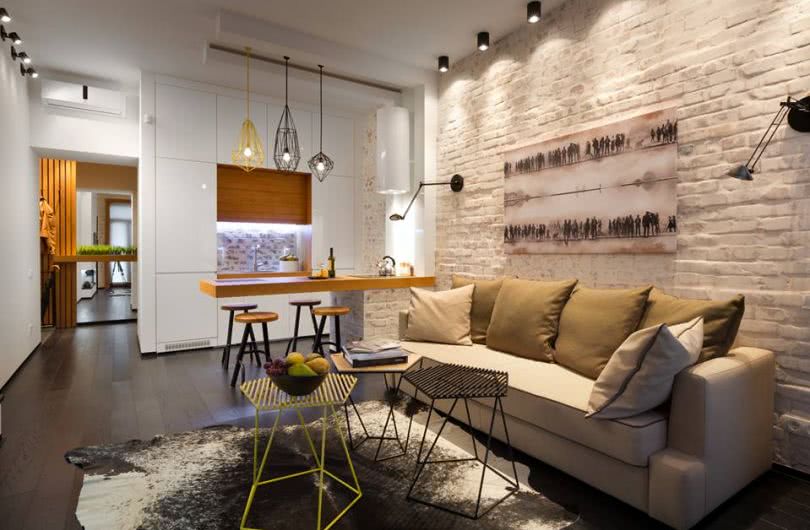 - дерзости комнате придаст отделка стен кирпичом, пола — светлым ламинатом.