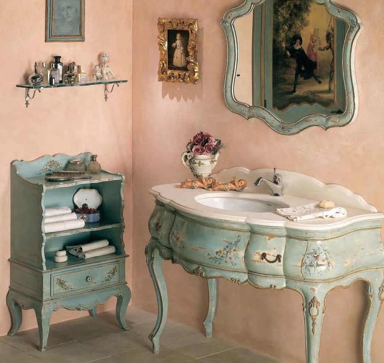 Основа — пастельные тона, на поверхности мебели искусственно создают потертости |
