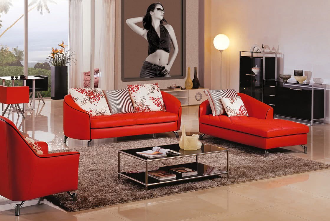 - Красный. Лучше всего смотрится с монохромными оттенками. Алая мягкая мебель удачно впишется в интерьер с белыми, серыми или светло-голубыми стенами. Если гостиная или спальня оформлена в стиле барокко или ампир, красного цвета диван можно дополнить черным деревом, позолотой, резьбой.