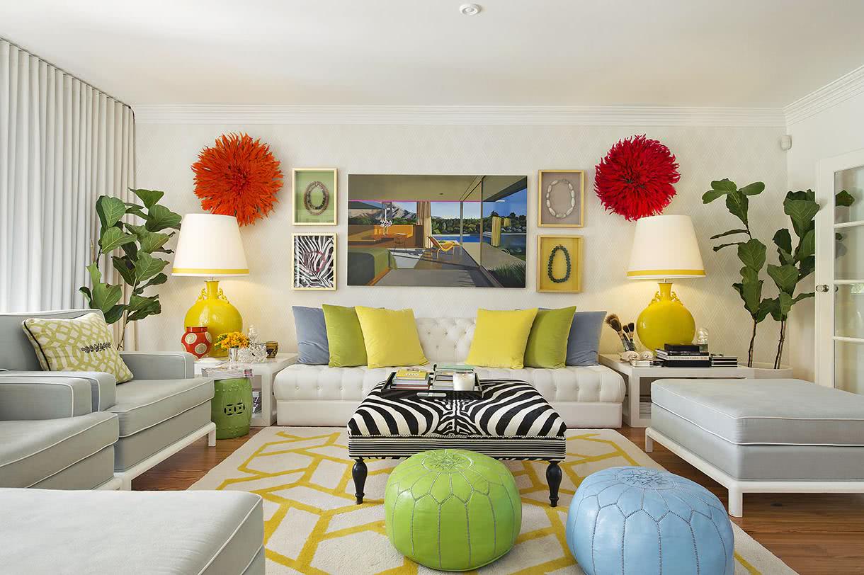 - в гостиной может быть белый диван, декорированный яркими подушками;