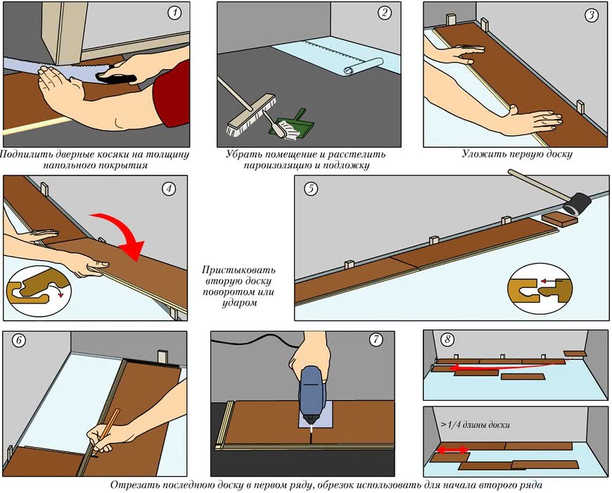 Только после всех перечисленных выше работ можно приступать к монтажу непосредственно самого ламинированного покрытия.