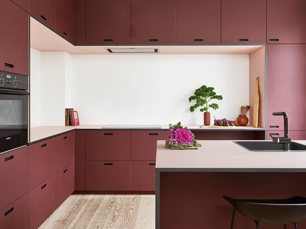 Хотя глубокий оттенок бордового ассоциируется в первую очередь с традиционным стилем, относящимся к аристократическим комнатам, этот цвет можно найти и в современной версии. В последнее время бордовый цвет можно встретить на кухнях, оформленных в современном стиле, где бордовый цвет украшает гладкие и блестящие фасады шкафов, играя ведущую роль в помещении. Он отлично сочетается с белой или черной столешницей и серебряными аксессуарами.