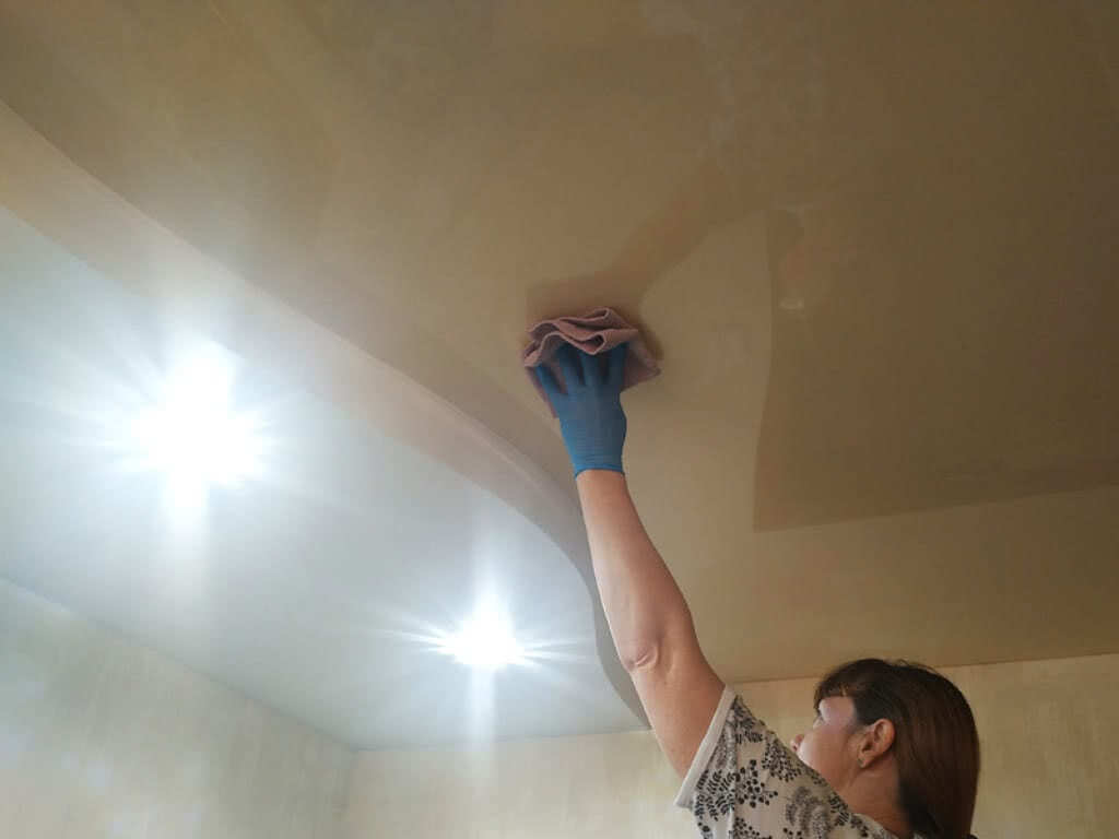- когда очищение глянцевого полотна завершено, потолок протирают сухой тряпкой из микрофибры, которая также эффективно убирает разводы;