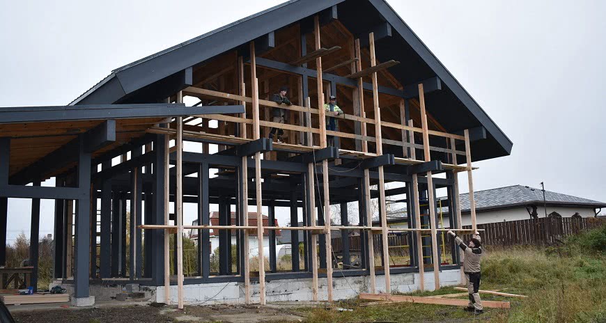 Каркасный дом своими руками собирают из отдельных элементов, раскраивая и подгоняя их на строительной площадке. Возможен монтаж более крупных секций или даже целых конструкций, заготовленных на заводе.