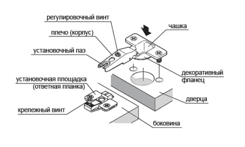 - для угловых шкафов или тумб любой конфигурации выбирают петли, которые при монтаже будут крепить под углом 45о;