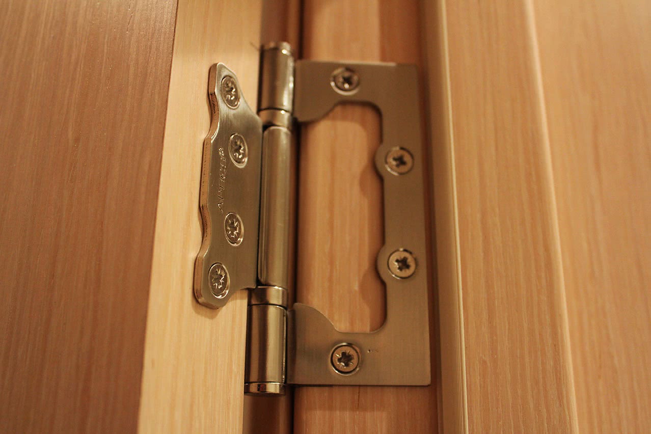 Под монтаж врезных петель нужно подготовить дверь. Фрезой по древесине делаются углубления в полотне, в которые потом вкладываются петли. Затем деталь прикручивается. Благодаря такому способу монтажа при открытии и закрытии двери петли практически не видны.