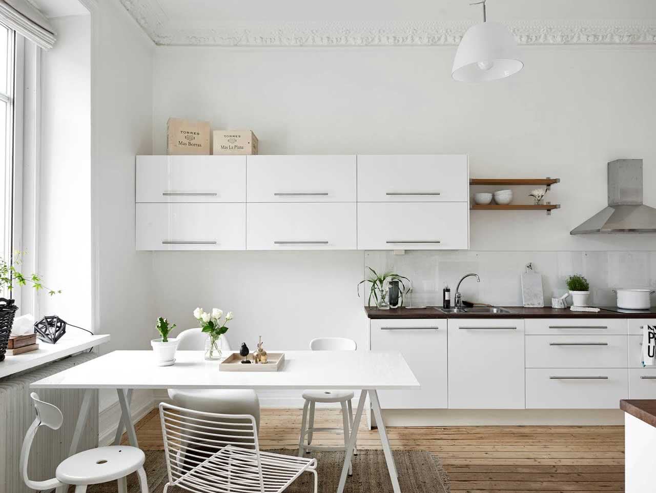 Очевидно, что ни подвал, ни белая бесконечность нежелательны, ни для одной из комнат, особенно, это неуместно на кухне и в спальне. А вот чрезмерно белоснежную залу можно спасти с помощью темного выразительного плинтуса и дверей, например, спустив ее с небес на землю.