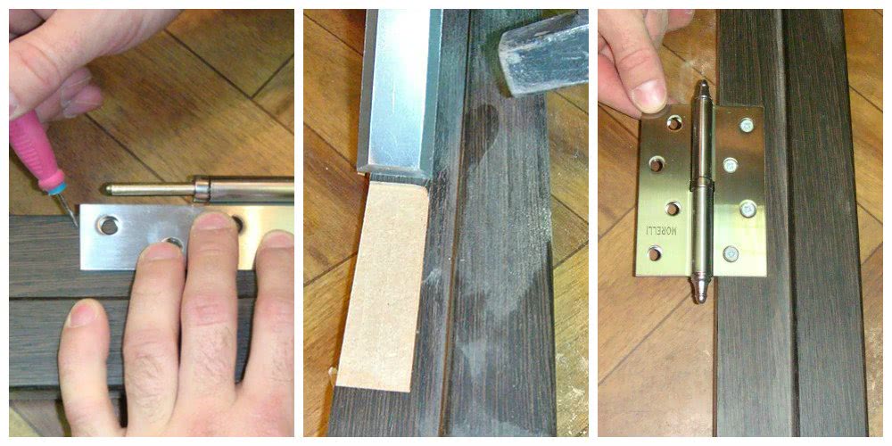 Как правильно установить подобные петли на дверь? Эта вариация фурнитуры крепится не так просто. Без фрезера и дрели не обойтись. Помимо подготовительного процесса, стоит позаботиться о помощнике, который будет периодически поддерживать короб или полотно двери. Пошаговый алгоритм действий: