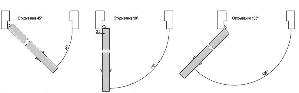 Петли на 90 градусов позволяют открывать створку мебели под прямым углом. Но на практике дверцы могут открываться даже на 120 градусов. По этой причине многие производители предпочитают в маркировке использовать большие значения (например, «петля 100»).