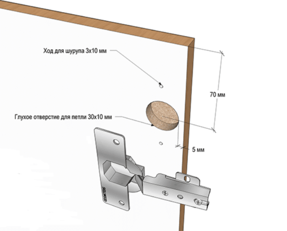 Ввиду того, что именно дверное полотно является подвижным объектом, в отличие от шкафа, начать крепление петли нужно с него.