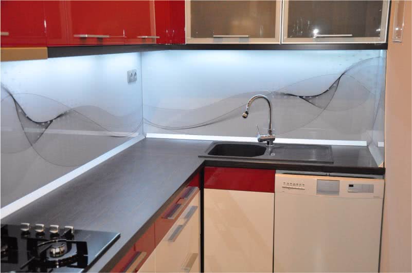 Этот материал внешне напоминает просто стекло. Такие панели бывают глянцевые и матовые. Листы гибкие и гладкие. Чаще всего такие фартуки продаются в готовом виде.